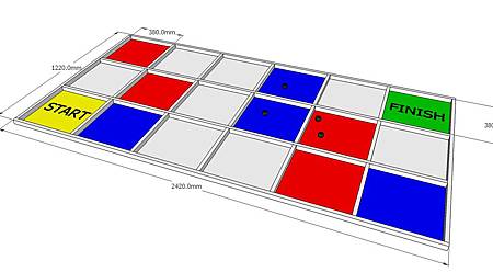2、比賽場地被平均分成18個格子(3×6,包括“開始”和“結束”這兩個格子),每個格子的尺寸是380mm×380mm。