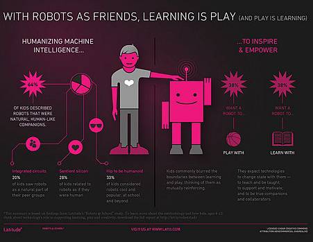 學齡小朋友喜歡機器人勝過喜歡父母親,還好受測的對象是來自英國、美國、法國、澳洲、德國和南非等地的350位的孩童,台灣的小朋友應該是會喜歡父母親,但想想小朋友喜歡機器人也不是沒道理,畢竟機器人可愛又討喜,重點是機器人很有想像空間,孩子的世界應該是寬廣不受限制的,不要用沒有變化的方法教育孩子,若有百變機器人陪小孩學習應該不錯,對了WRO2012創意賽可以試試人性化的陪伴學習機器人。